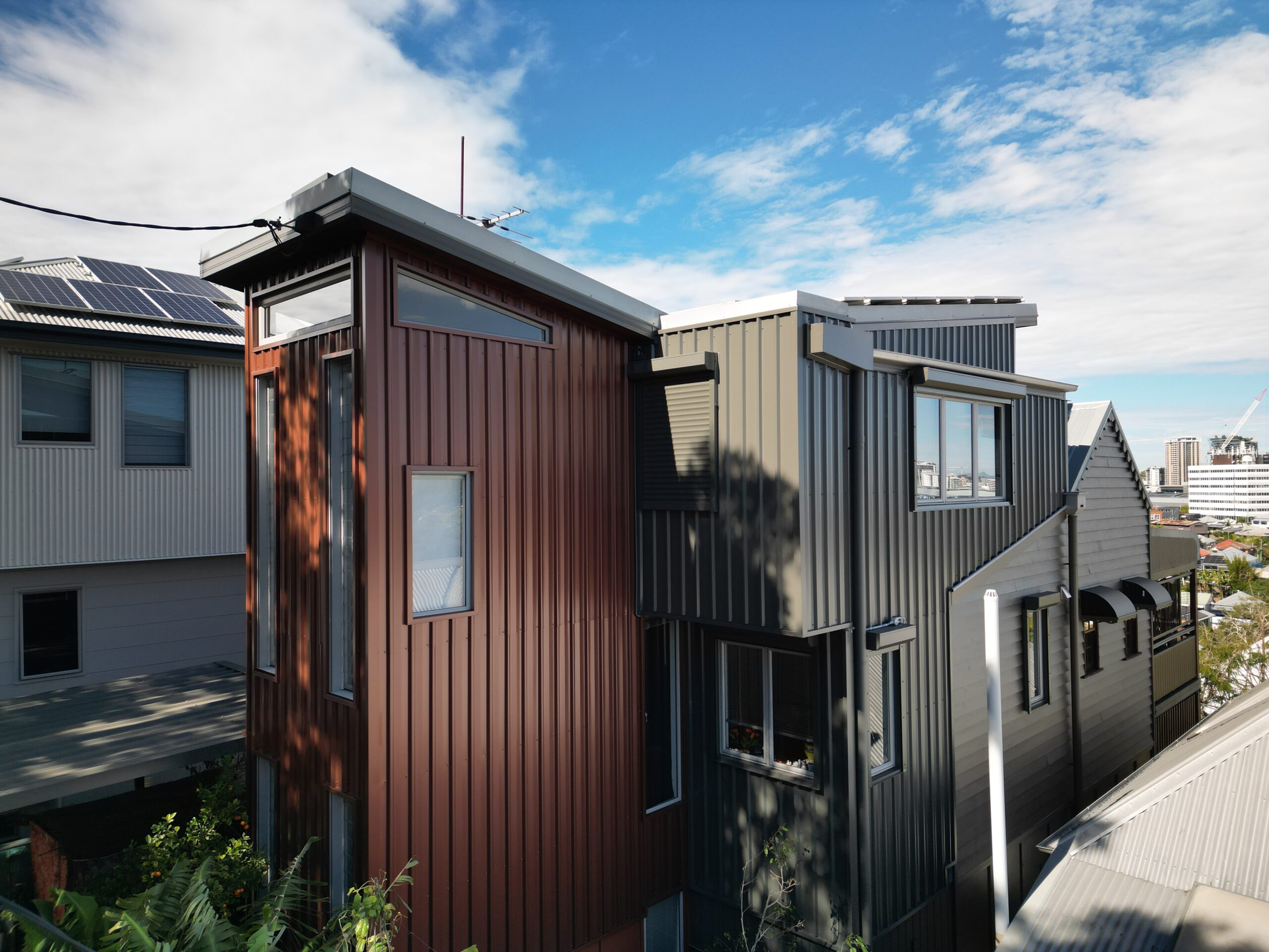 The choice of materials was crucial in bringing the Petrie Terrace vision to life. For this project, we supplied and installed Trimdeck wall cladding in two standout Colorbond® Steel finishes: Aries® and Woodland Grey®, both sourced from Lysaght, Australia’s trusted supplier of quality steel products. Colorbond® Steel Aries® delivers a fresh, modern energy, catching the light and accentuating the building’s lines, while Woodland Grey® provides depth, contrast, and timeless appeal.